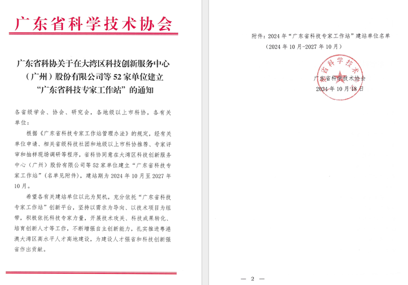 近日,廣東省科協公布《廣東省科協關于在大灣區科技創新服務中心(廣州)股份有限公司等52家單位建立“廣東省科技專家工作站”的通知》。